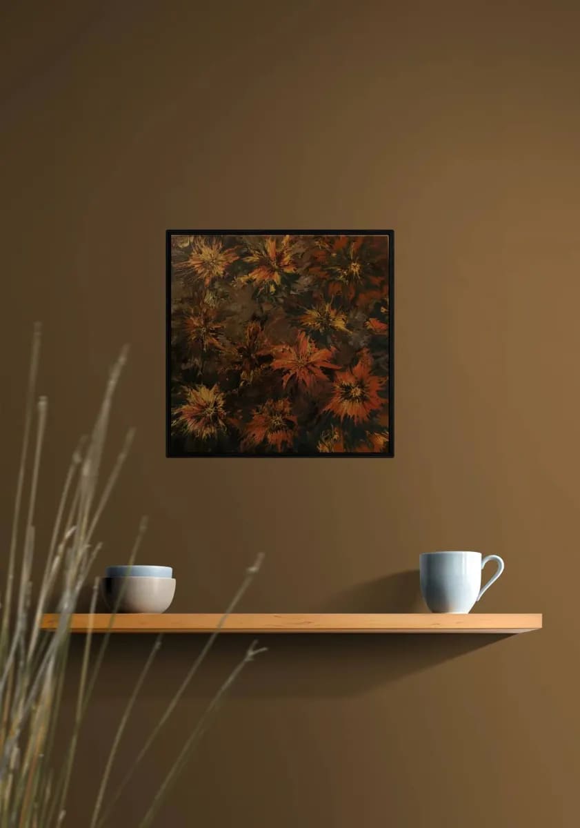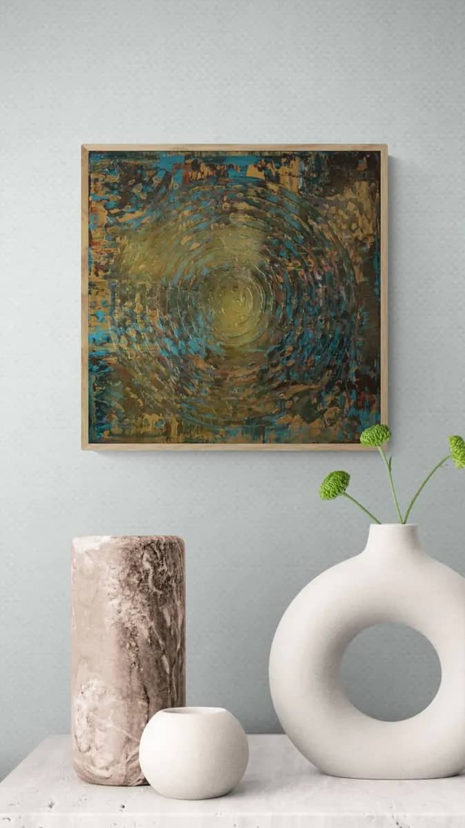 A luminous gold circle frames the yin-yang, a timeless symbol of harmony and duality. The patterned background of shifting colors and rhythms creates a sense of depth and movement, emphasizing balance amid change. The work invites reflection on unity within opposites — light and dark, order and chaos, stillness and motion.-“Valgustav kuldne päike raamistab yin-yangi, ajutut harmoonia ja duaalsuse sümbolit. Mustriline taust, kus värvid ja rütmid vahelduvad, loob sügavuse ja liikumise tunde, rõhutades tasakaalu muutuste keskel. Teos kutsub mõtisklema ühtsuse üle vastandites — valgus ja pimedus, kord ja kaos, liikumatus ja liikumine.”